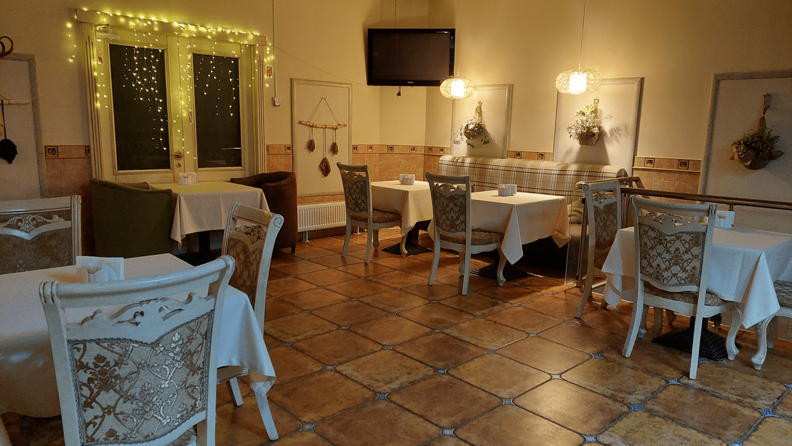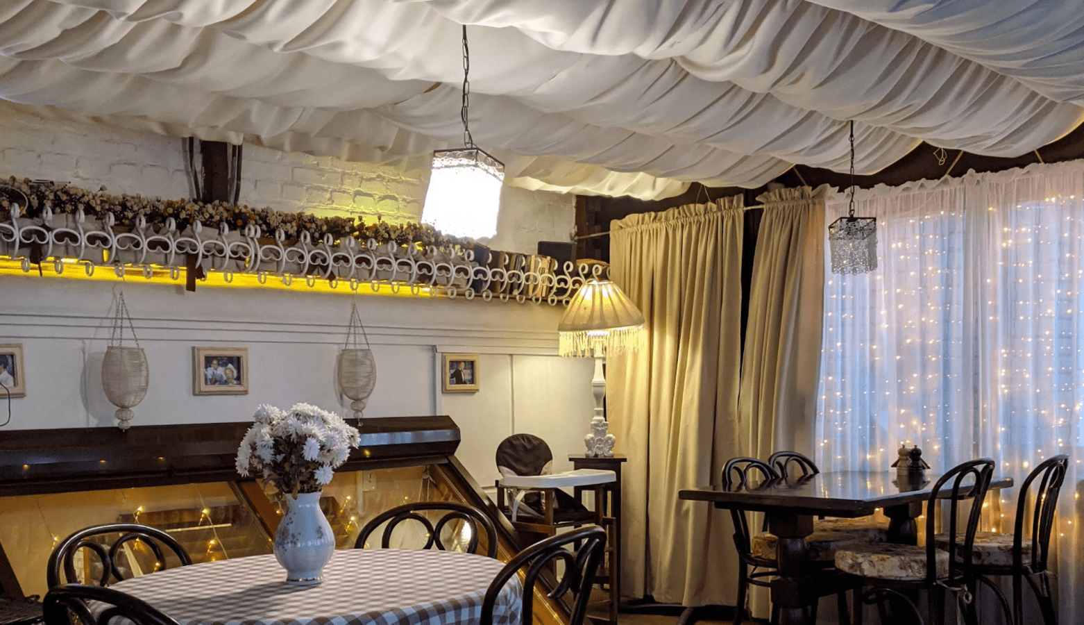 Інтер’єр ресторану “Веранда” виконаний у ретростилі: зі світлими стінами, дерев’яними меблями, старовинним декором, великими вікнами. До речі, вікна можуть бути незавішеними, що візуально збільшує приміщення. Або ж прикрашеними напівпрозорою білою тюллю чи гірляндами.
